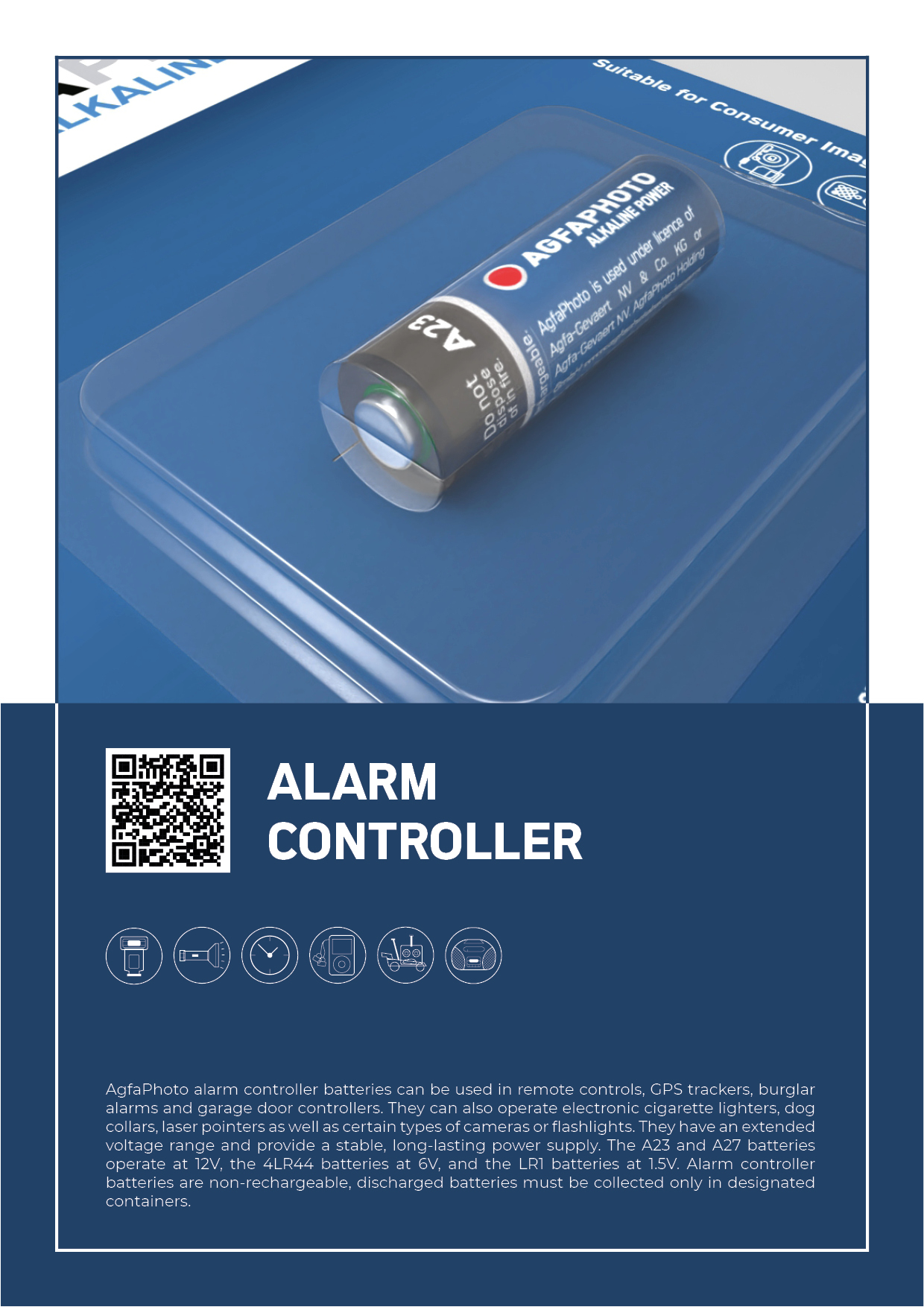 AgfaPhoto häiresüsteemi kontrolleri patareisid saab kasutada kaugjuhtimispultides, GPS-jälgijates, sissemurdmisalarmides ja garaažiukse kontrollerites. Need sobivad ka elektrooniliste sigaretisüütajate, koerakaelarihmade, laserpointerite ning teatud tüüpi kaamerate või taskulampide energiaallikateks. Neil on laiendatud pingevahemik, pakuvad stabiilset ja kauakestvat toidet. A23 ja A27 patareid töötavad 12 V pingel. Häiresüsteemi kontrolleri patareisid ei saa laadida ja tühjenenud patareid tuleb viia ainult selleks ettenähtud konteineritesse.